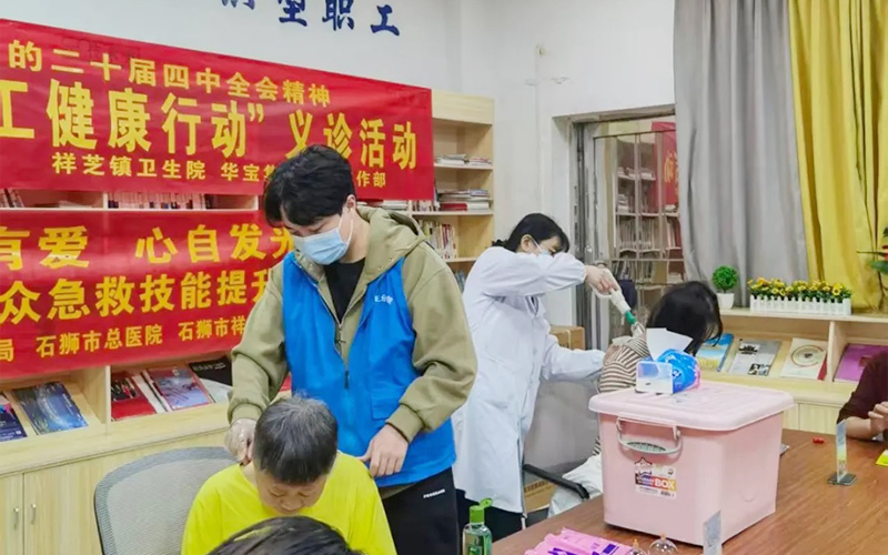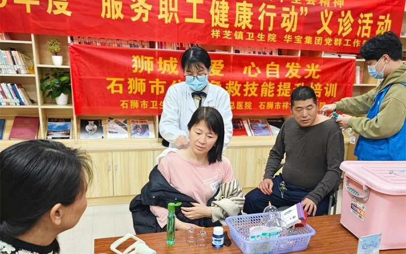 下午15时起,职工们陆续来到义诊区域。祥芝镇卫生院专业医护团队耐心接诊,为职工提供中医拔罐、艾灸调理等项目,并开展职工专项筛查服务和医疗科普。许多职工表示:“平时工作忙,很少专门去医院检查,这样的活动太贴心了!”